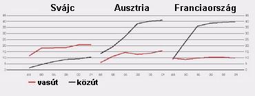 A svájci modellnek az áruszállítási közlekedési piacon való hatását jól jellemzi az alábbi ábra, amely a Transzalpin teherforgalom alakulását mutatja az említett három országban.