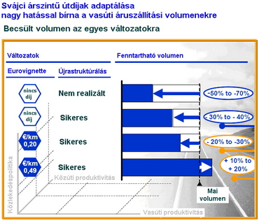 A lépés eredményességét jól jellemzi, hogy ha csak az EU 15-ök bevezetnének egy svájci árszínvonalú közös díjszabást (Eurovignette), akkor párosítva mindezt a vasutak újrastrukturálásával, a vizsgálatok szerint ez rövidtávon önmagában mintegy 3-4 százalékkal megemelné a vasút részarányát a teherszállításban a közút rovására, és mintegy 8%-al növelné a vasúti áruszállítás profitabilitását.