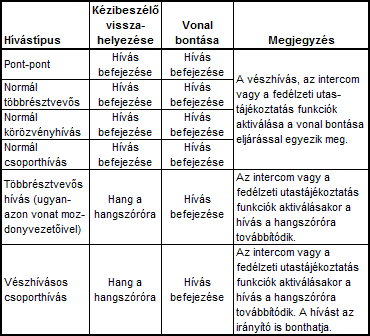 A kabin rádió lehetővé kell tegye a hívások befejezését, ha a mozdonyvezető számára ez engedélyezett (pl. tolató csoporthívást és nem általa kezdeményezett vasútüzemi vészhívást a mozdonyvezető nem jogosult befejezni). Normál csoport- és körözvényhívás esetén a hívásból való kilépés mellett biztosítani kell a többi résztvevő közötti hívás fennmaradását (hívásból történő kilépés). A kabinrádió kézibeszélőjének visszahelyezése tehát nem jelentheti automatikusan magának a hívásnak a megszakítását, befejezését - lásd táblázatok alább.