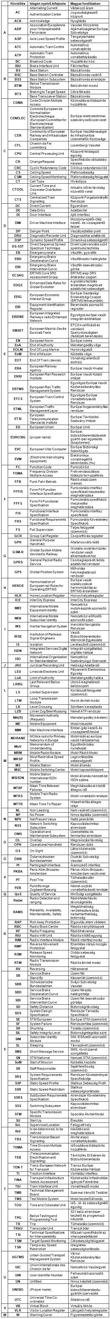 Az alábbiakban az ERTMS kapcsán felmerülő rövidítések, betűszavak jegyzéke olvasható.