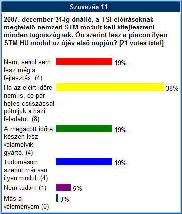 Szavazás 11 - 2007. december 31-ig önálló, a TSI előírásoknak megfelelő nemzeti STM modult kell kifejleszteni minden tagországnak. Ön szerint lesz a piacon ilyen STM-HU modul az újév első napján?
