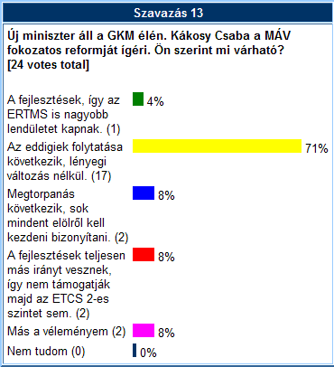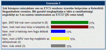 Szavazás 5 - Sok hónapos csúszásban van az ETCS rendszer üzembe helyezése a Kelenföld-Hegyeshalom vonalon. Mit gondol megkaphatja-e idén a vasúthatósági engedélyt az 1-es számú vasútvonalon az ETCS?